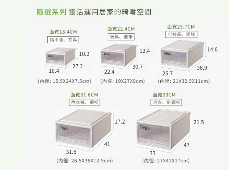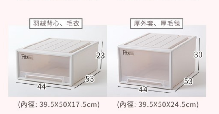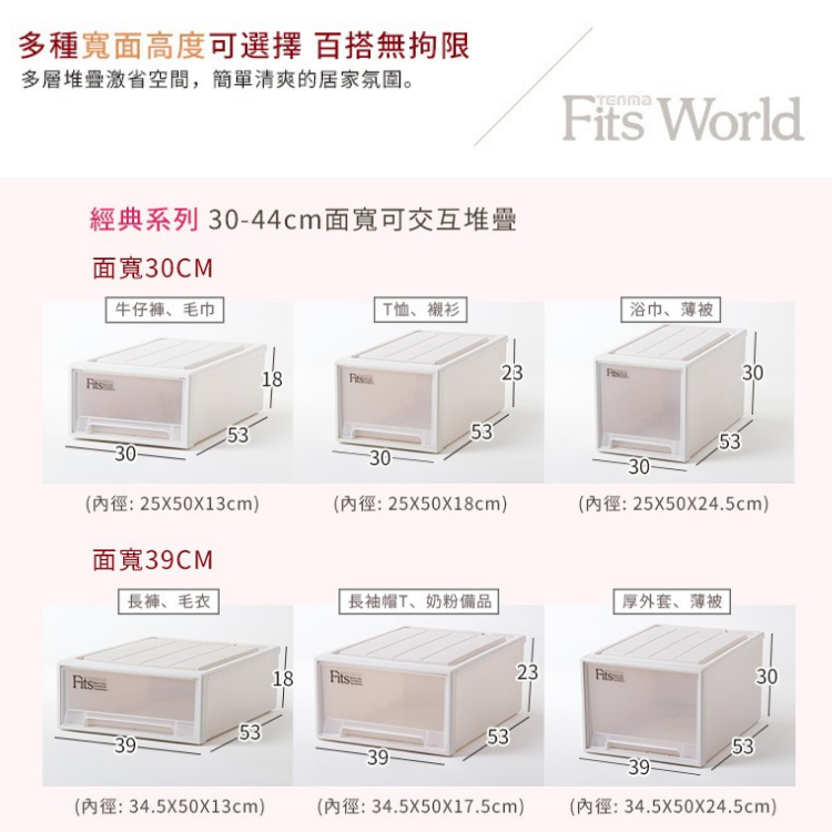 市面上常見的尺寸分別為 30、39、44 cm面寬,相同深度與寬度,讓收納後的視覺空間整齊又美觀。
