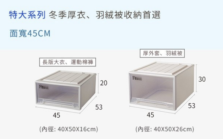 針對大容量收納需求的特大系列,不論是換季的厚衣物、羽絨被或是整套床包,特大容量通通可一次集中儲放收納。