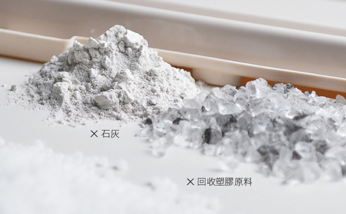 市面上部分塑膠收納品添加石灰粉,商品易破裂、變形,商品多呈淡黃灰色居家使用可能影響安全。而採用回收塑膠材料的製成品無法呈現純白色調,經常以有色面板來混淆消費者視覺,在厚度的部分則易透光較薄易碎。