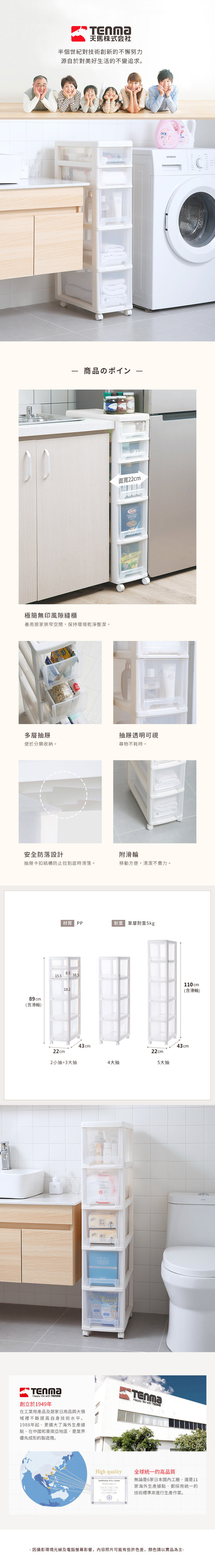 尺寸:寬22×深43×高(含滑輪)110cm、[抽屜內徑]寬15.5×深38.5×高18.2cm