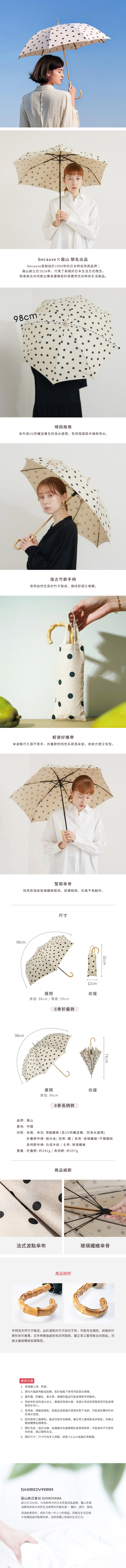 材質:[傘面]聚酯纖維(含UV防曬塗層、防潑水處理)、[中棒]合成木板、[主骨]玻璃纖維