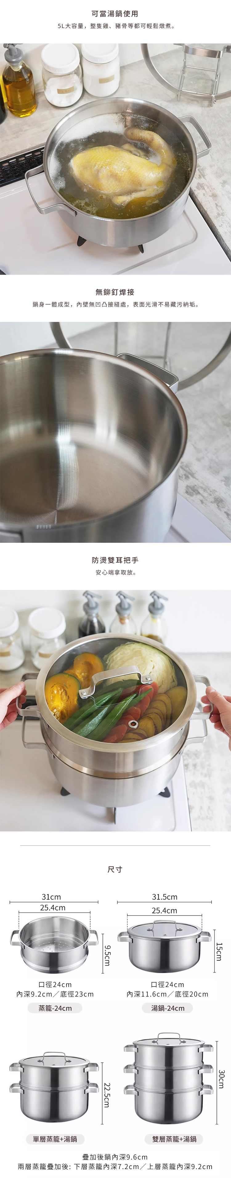尺寸:[蒸籠外徑]長31×寬25.4×高9.5cm、[蒸籠內徑]口徑24×底徑23×高9.2cm、[湯鍋外徑]長31.5×寬25.4×高15cm、[湯鍋內徑]口徑24×底徑20×高11.6cm