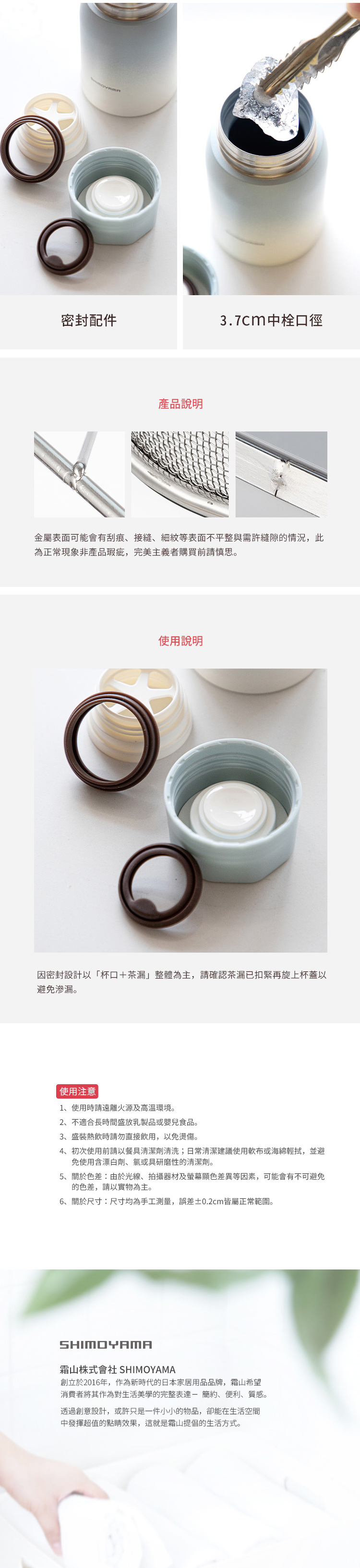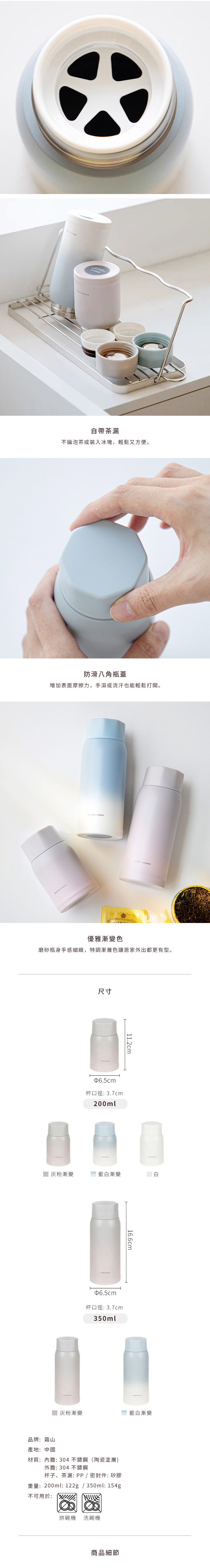 材質:[內膽]304不鏽鋼(陶瓷塗層)、[瓶身]304不鏽鋼、[瓶蓋/茶漏]PP、[密封圈]矽膠