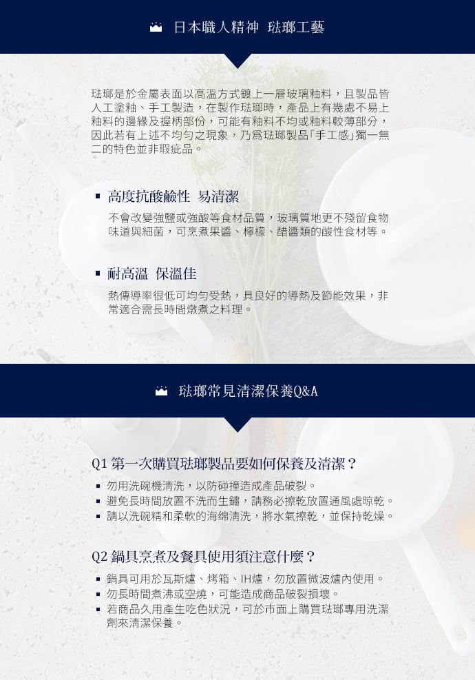 6、琺瑯具熱傳導性,使用時應注意溫度,以免燙傷。