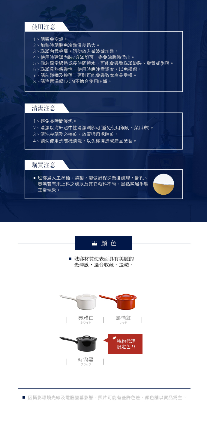 ※琺瑯為人工塗釉、燒製,製做過程採懸掛處理,掛孔、壺嘴若有未上料之處以及其它釉料不勻、黑點純屬手製正常現象。