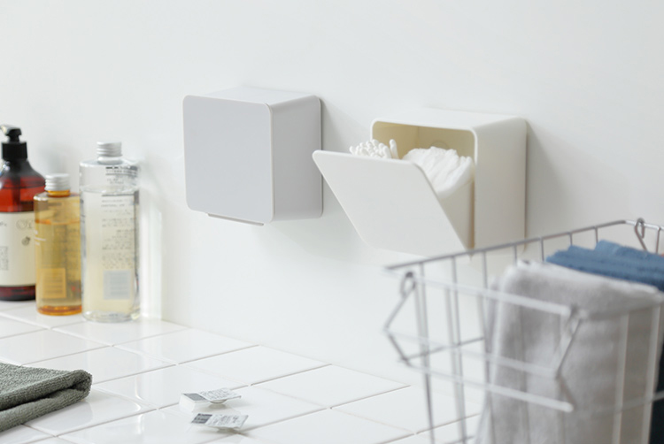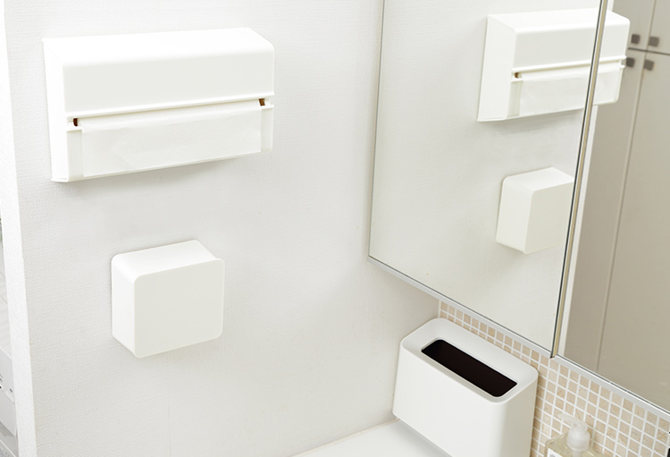 小物であふれる洗面まわりをすっきりと整える大小のポケット。
