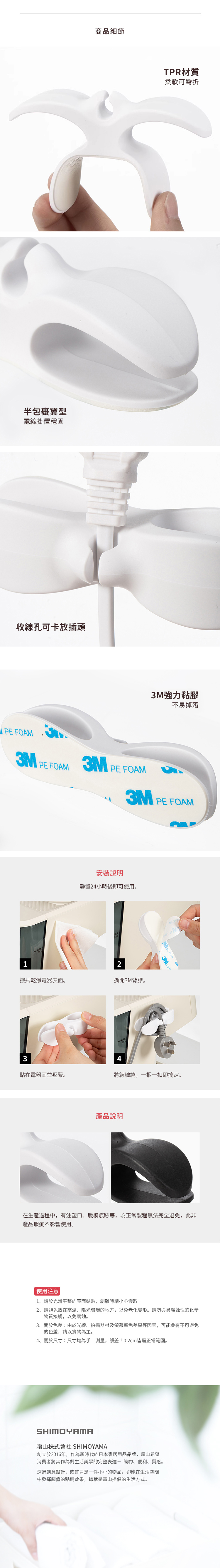 【日本霜山】免鑽釘無痕式電線固定收納夾/小物掛勾-3入-多色可選