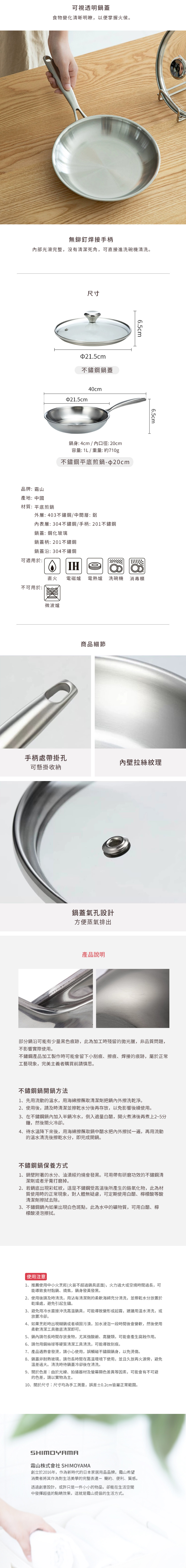 尺寸:(含手柄)長40×高6.5cm、[鍋口直徑]21.5cm、[鍋身]4cm、[內口徑]20cm