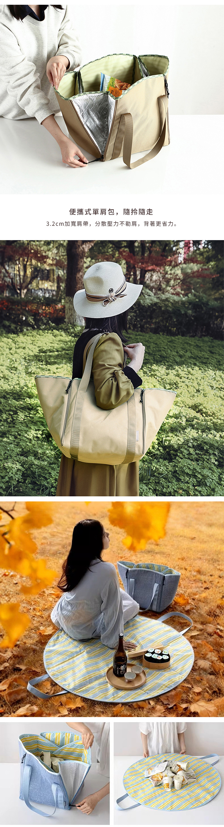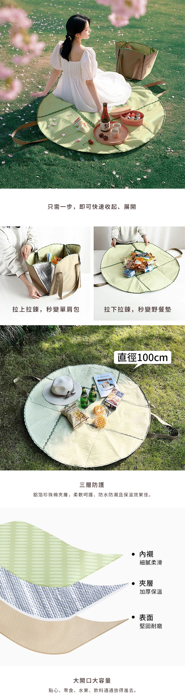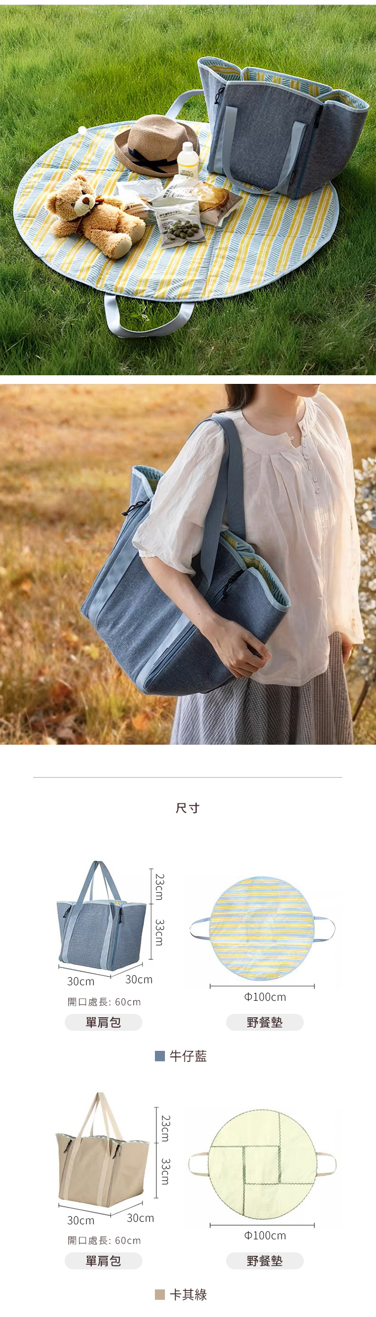 尺寸:[單肩包]長30×寬30×高33cm,(含背帶高56cm)、[野餐墊]直徑(不含背帶)100cm