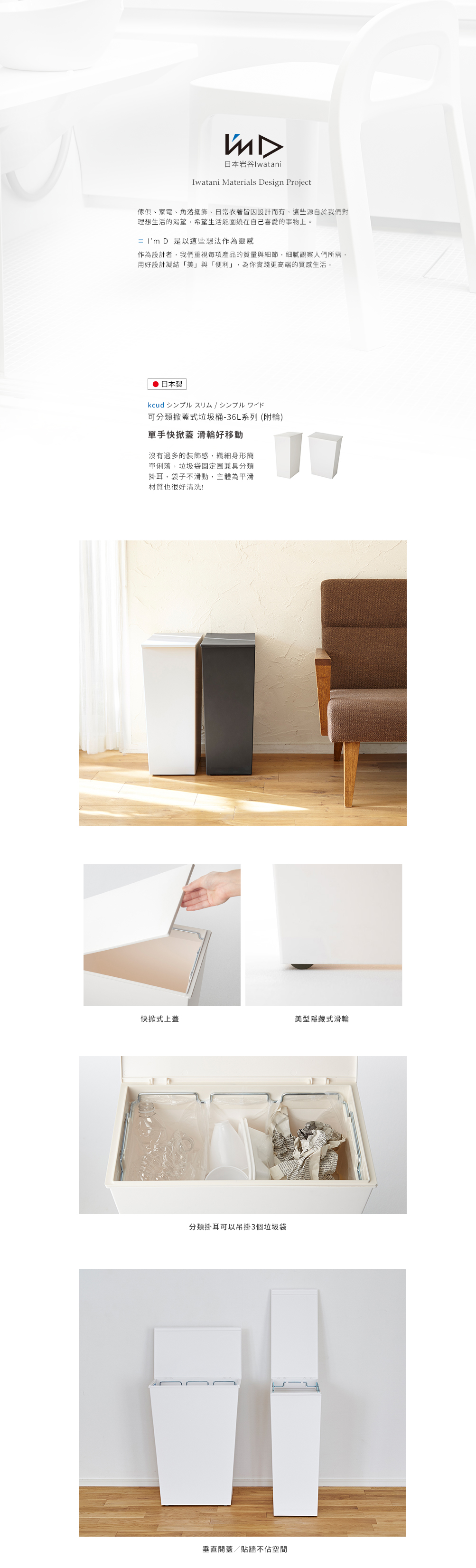 材質:[主體,滑輪]聚丙烯、[分類掛耳]鋼(三價鉻電鍍)、[垃圾桶框口]ABS